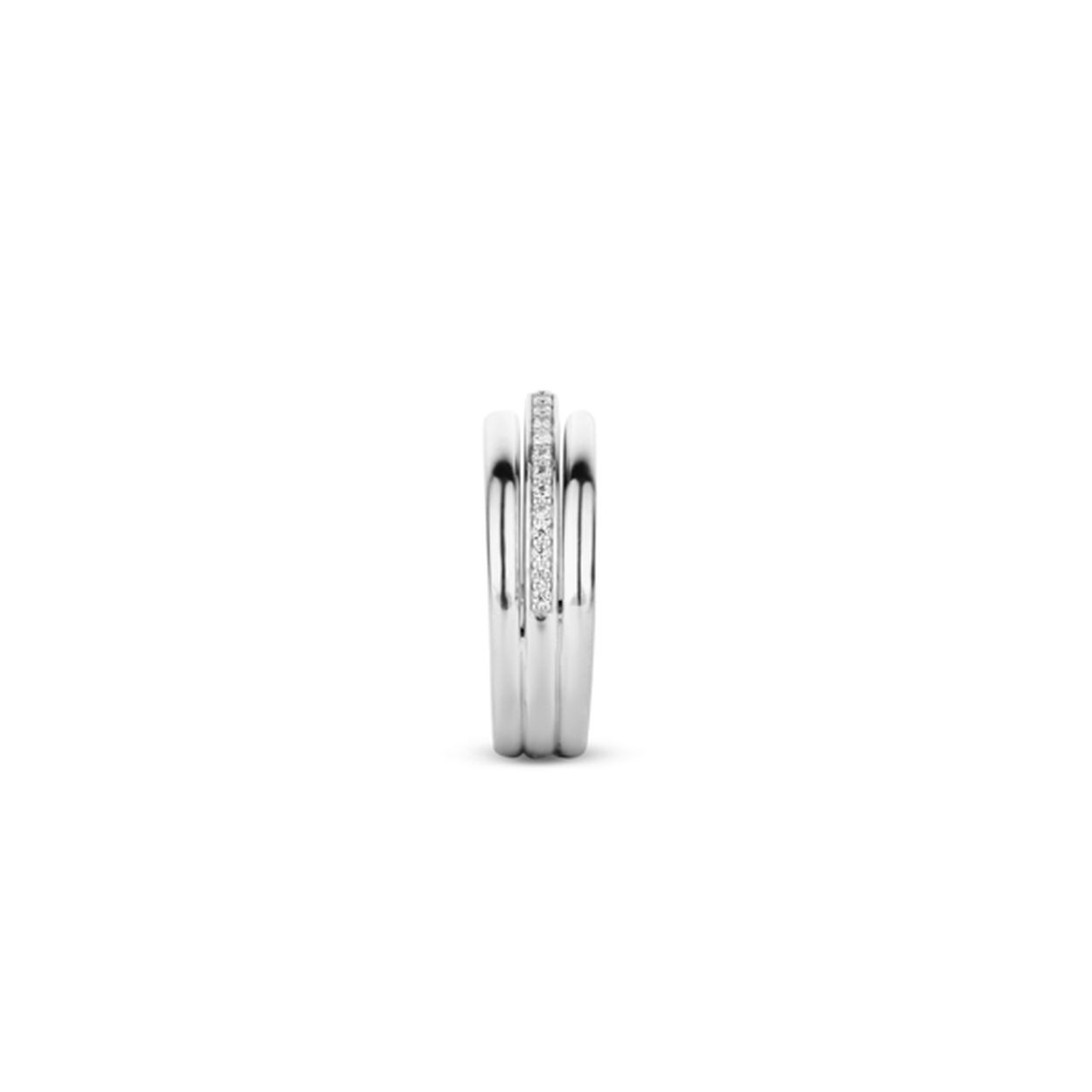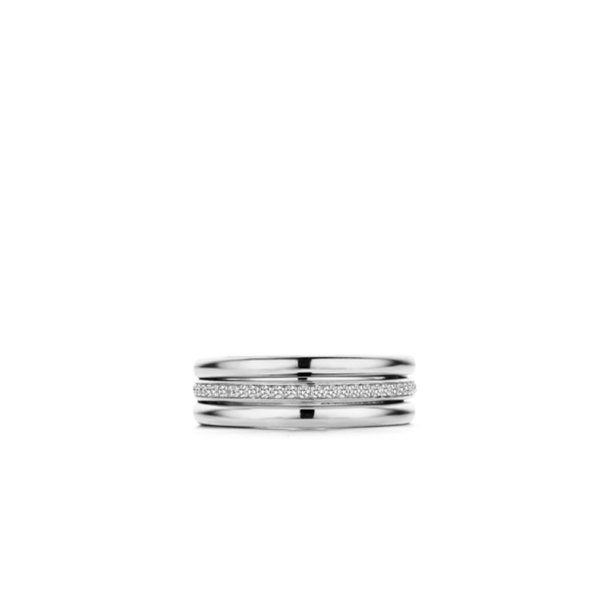 Onze ring met drie lagen zilver en witte zirkonia pavé zetting heeft een casual glamourous karakter. Eenvoud in het design maar oog voor detail. De ware magie vind je in haar zilver.