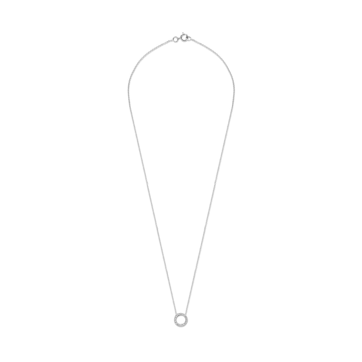Dit sprankelende collier van 14k witgoud heeft een ronde hanger met zirkonia’s. Door de bevestiging ligt de hanger met een doorsnede van 7,3 mm altijd plat op de hals. Het collier heeft een lengte van 42 cm en is mooi alleen te dragen of in combinatie met andere sieraden uit onze collectie.