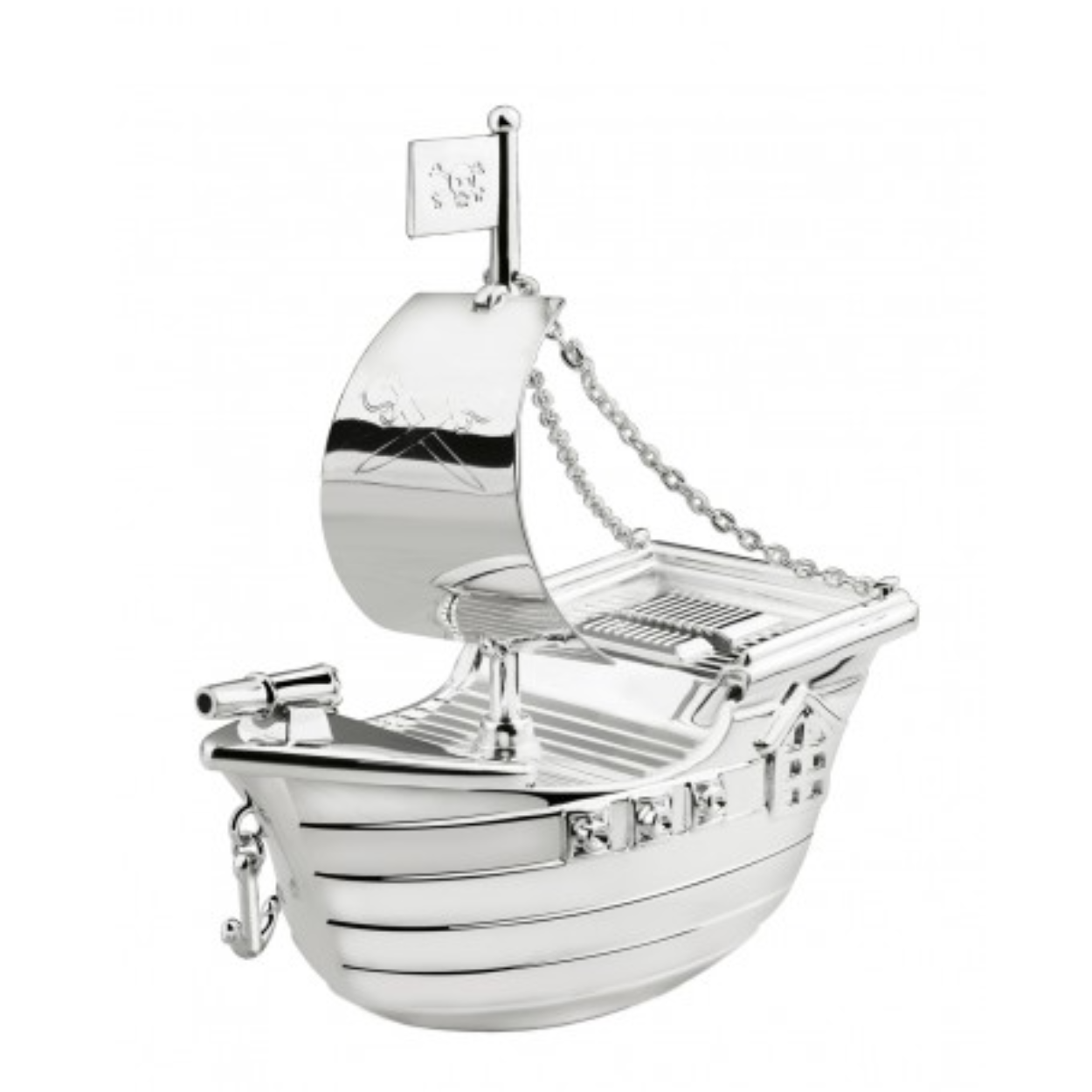 Mooie Zilverstad Spaarpot in de vorm van een Piratenboot. Afmetingen zijn 13.5x6.5x15.5 centimeter. met graveerplaatje.
