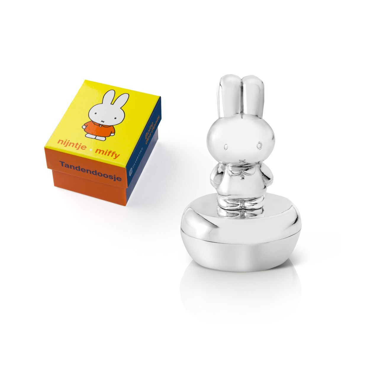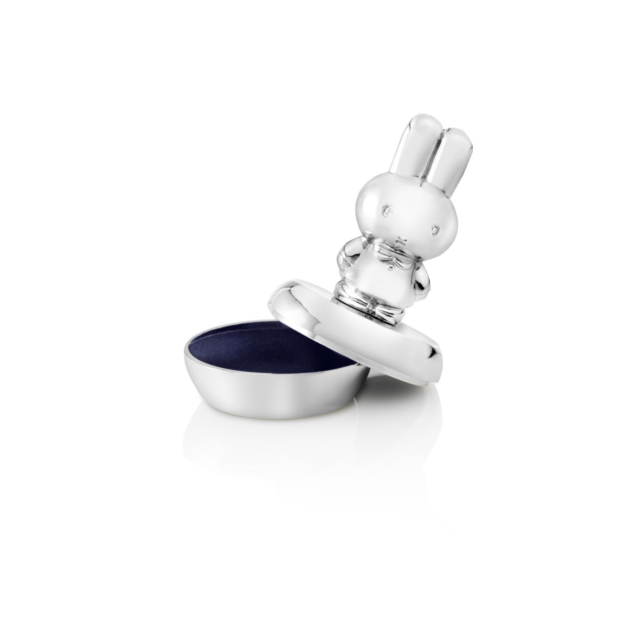 Tanden- of haarlokdoosje met het beroemde konijn nijntje op de deksel. De binnenzijde is bekleed met blauw velours. Dit doosje kan gegraveerd worden, wat het een persoonlijk geschenk maakt en is verzilverd en gelakt. Afmeting (mm) 39x39x59mm.